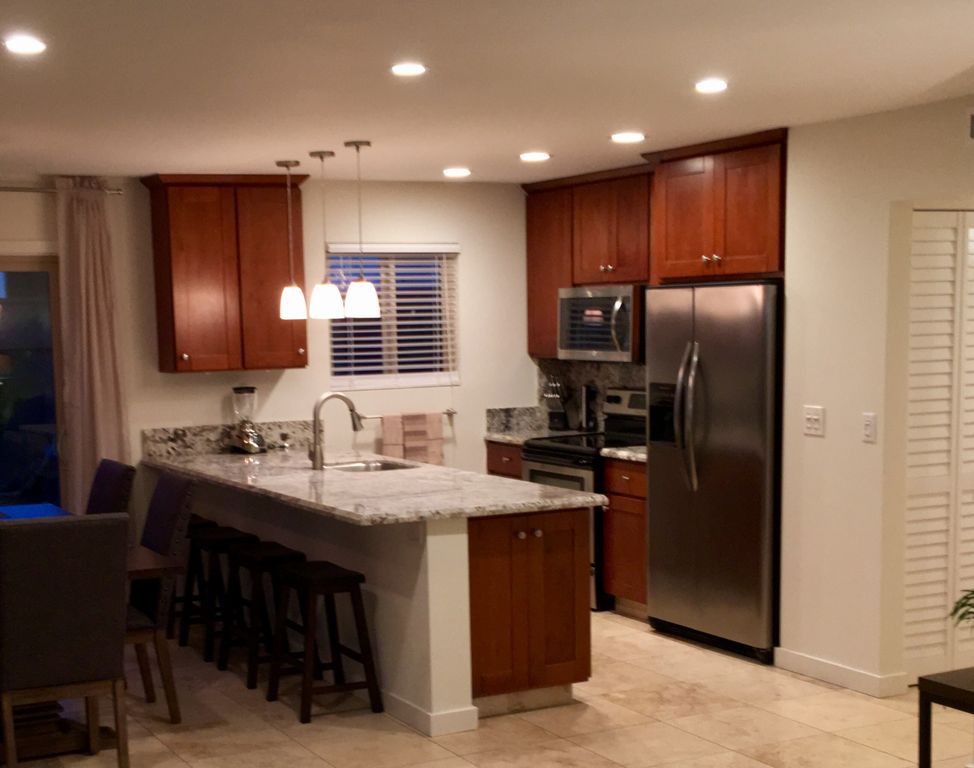 Travertine floors throughout have the look and feel of an upscale property. Gorgeous Kitchen with Cherry Shaker Cabinetry & Quartz Counters, Stainless Appliances, Fully Stocked with all of the Culinary Utensils you will need for bringing out your "inner Chef!"