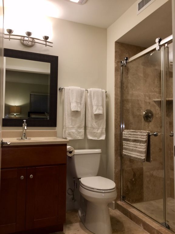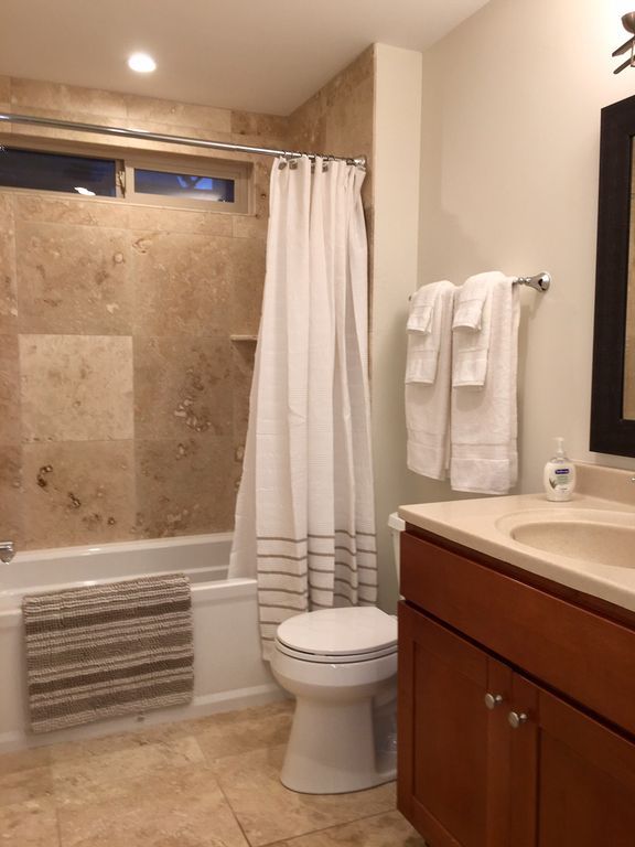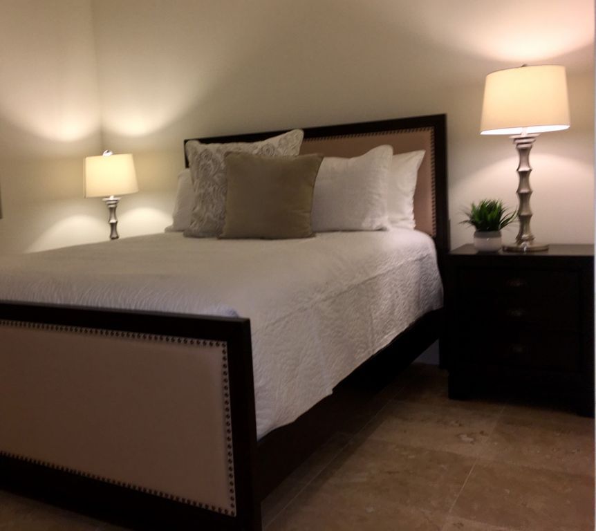 2 Bedrooms are both generous in size. The Master has a Cak King Bed with Memory Foam Mattress, 2 Nightstands, Dresser with Flat Screen TV above & a Large Walk-in Closet! The attached En-Suite bathroom features a Travertine Tiled Shower with Glass Enclosure & New Cherry Vanity. Lots of Plush Towels & Linens will make you feel right at home!