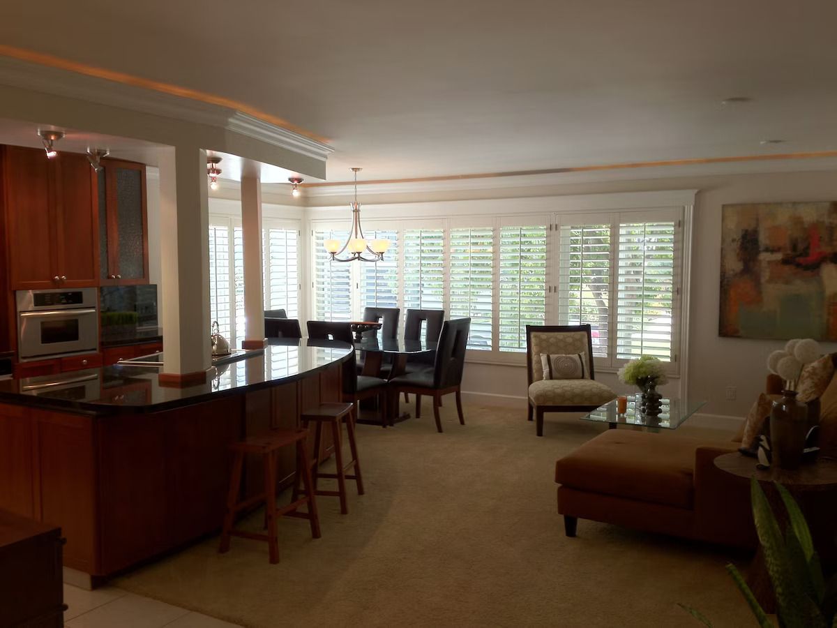 The kitchen is open to both the living & dining areas, all of which feature designer lighting & plantation shutters. Italian stone flooring flows from the entry into the kitchen & bath areas. Upscale carpeting is throughout the living, dining, and bedroom areas. The living room features a comfortable sectional sofa & flat screen TV. The dining area has a wood/glass table with leather chairs.
