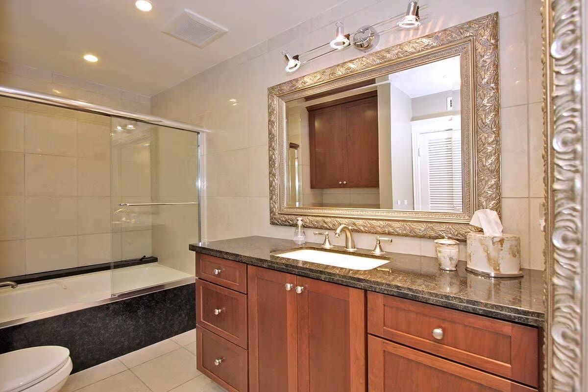 The master bedroom features a top of the line Comfortaire mattress (KING). Then, two nightstands, Dresser & 42' LED wall mounted TV. Luxury abounds in the master bath, with dual vanities, tumbled stone walls, an incredible shower with rain showerhead, and spacious walk-in closet. The secondary bath is equally luxurious, however with a single vanity, tub/shower, and closet with stacked full size front loading washer & dryer. The second bedroom is currently setup as a bedroom with a queen bed, two night stands and a desk.