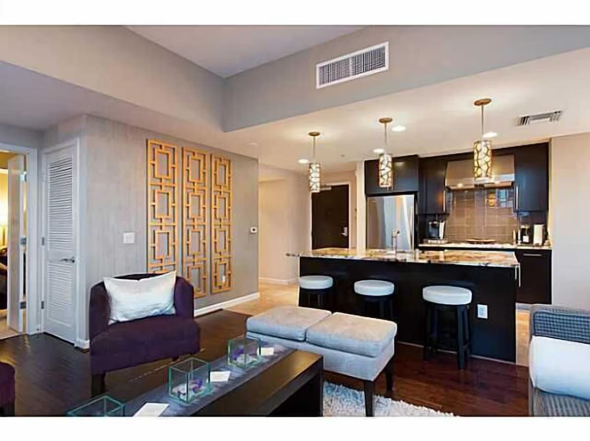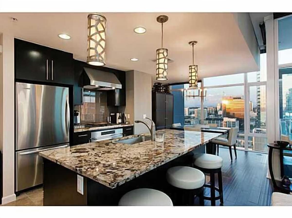Back inside, your VIP sky lounge provides a calm & collective escape, with floor to ceiling glass walls that encapsulate Dramatic Views! This is penthouse quality living on a more intimate scale. Our guests have continually been in 'aah' upon arrival. From the hardwood & travertine floors, to the stunning granite surfaces, the thoughtfully designed built-ins and carefully selected décor...SkyJewel 2203 has been meticulously customized to appease those who demand only the very best!